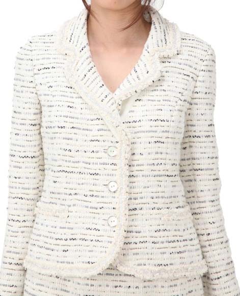 襟なしのシャネルスーツのデザインは、シンプルな分だけ素材の良さが光ります。