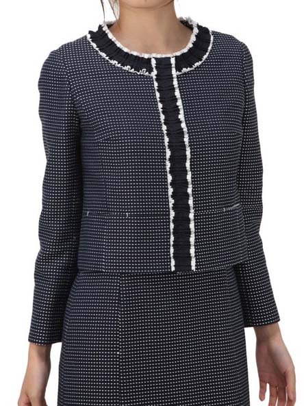 襟元とスカートの裾のフリルがキュートな、深いネイビーカラーのスカートスーツです。