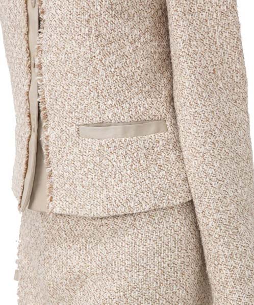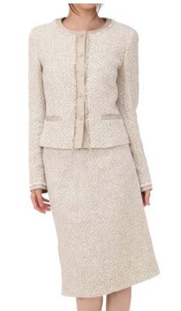 やさしいカラーのノーカラースーツは、小さなフリンジが特徴的です。