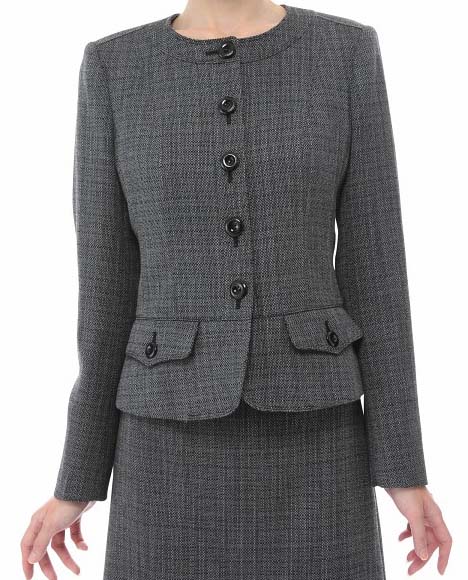 襟なしのシャネルスーツのデザインは、シンプルな分だけ素材の良さが光ります。