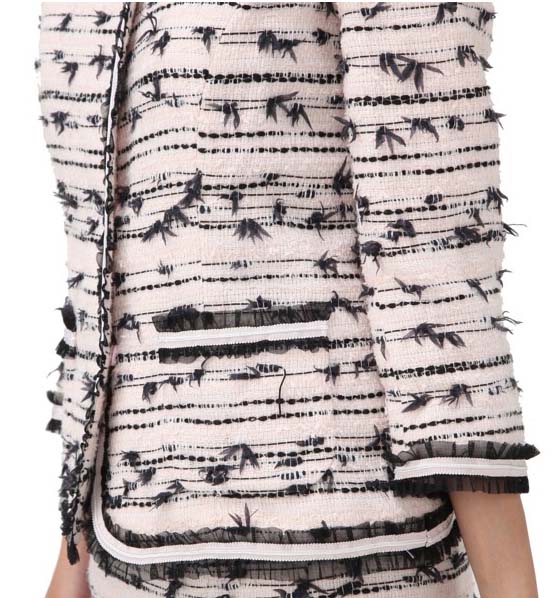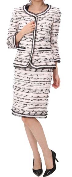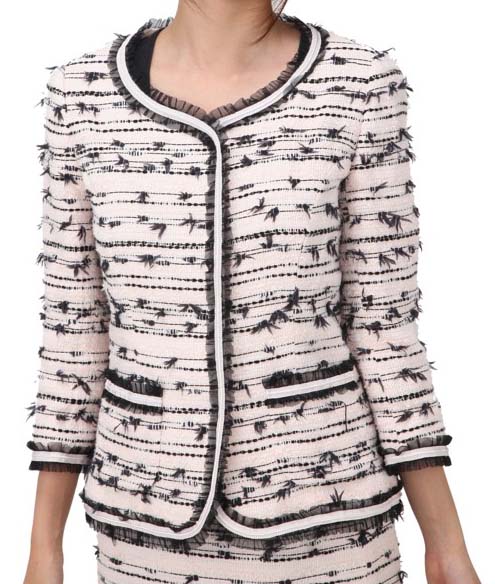 前楯や襟、ポケットなどにチュールレースが飾られたかわいらしいスーツです。
