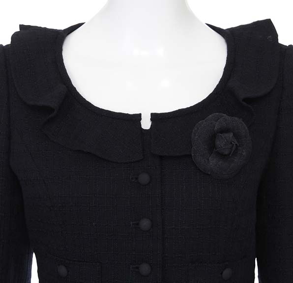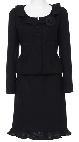 襟元とスカートの裾のフリルがキュートな、深いネイビーカラーのスカートスーツです。