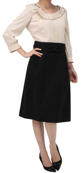 ワンピースは、ブラウス+スカート風のデザインで、ブラウス襟や袖にはプリーツがあり、ウエス部分には大きめのリボン付。